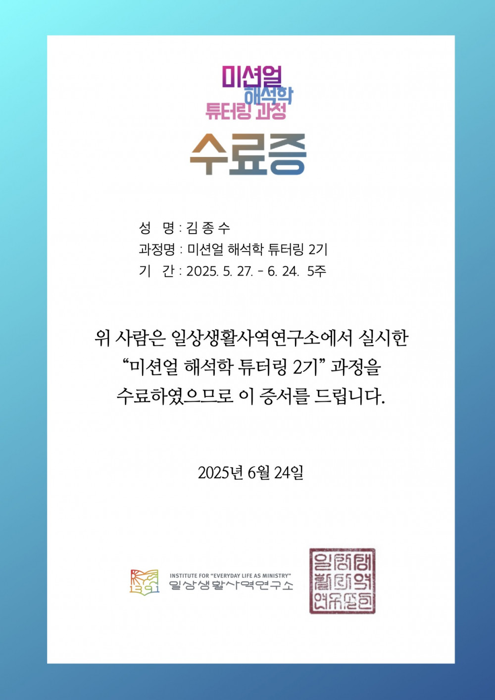 5월 27일~6월 24일 매주 화요일 오후 9시-11시까지 온라인으로 진행된 미션얼 성경해석학 튜터링 북클럽 2기가 마무리되었습니다. 김종수 목사님 등 5명의 참가자들이 꾸준히 모임에 참석해 주셔서 과정을 수료하셨습니다.![]()