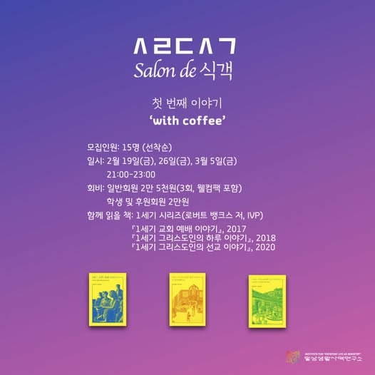3주간 ZOOM 미팅 방식으로 세 번의 모임을 갖습니다. 한 주에 한 권씩 참가한 분들과 함께 커피 내리고 마시며 윤독 후에 대화합니다.