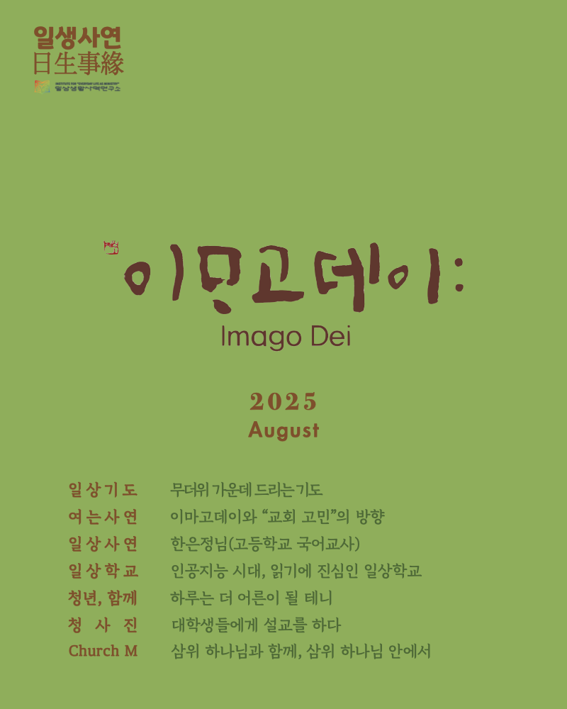 2025년 한해 우리 연구소는 복음(하나님), 문화(세상), 교회(하나님의 백성 공동체)의 미션얼 삼각 구도 가운데 복음, 즉 하나님이 어떤 분인가에 초점을 맞추는 첫 번째 시도로, “이마고데이(Imago Dei)”라는 주제로 일상생활의 신학과 미션얼 상상력을 심화하려고 애썼습니다. 이 주제는 우선 당장에 보기에는 인간론에 대한 언급이지만 하나님과 관련 속에서 인간을 생각하도록 합니다. 결국 복음, 그리고 하나님을 어떻게 이해하느냐에 따라 인간이 어떤 존재이며 어떻게 살아야 하는지가 결부됩니다. 당연히 그릇된 하나님 이해에서 하나님의 형상인 이마고데이로서 인간이해가 왜곡됩니다. “이ᄆᆞ고데이”라는 캘리그라피의 의도가 거기에 있었다는 것을 다시 한 번 언급하고 싶습니다.