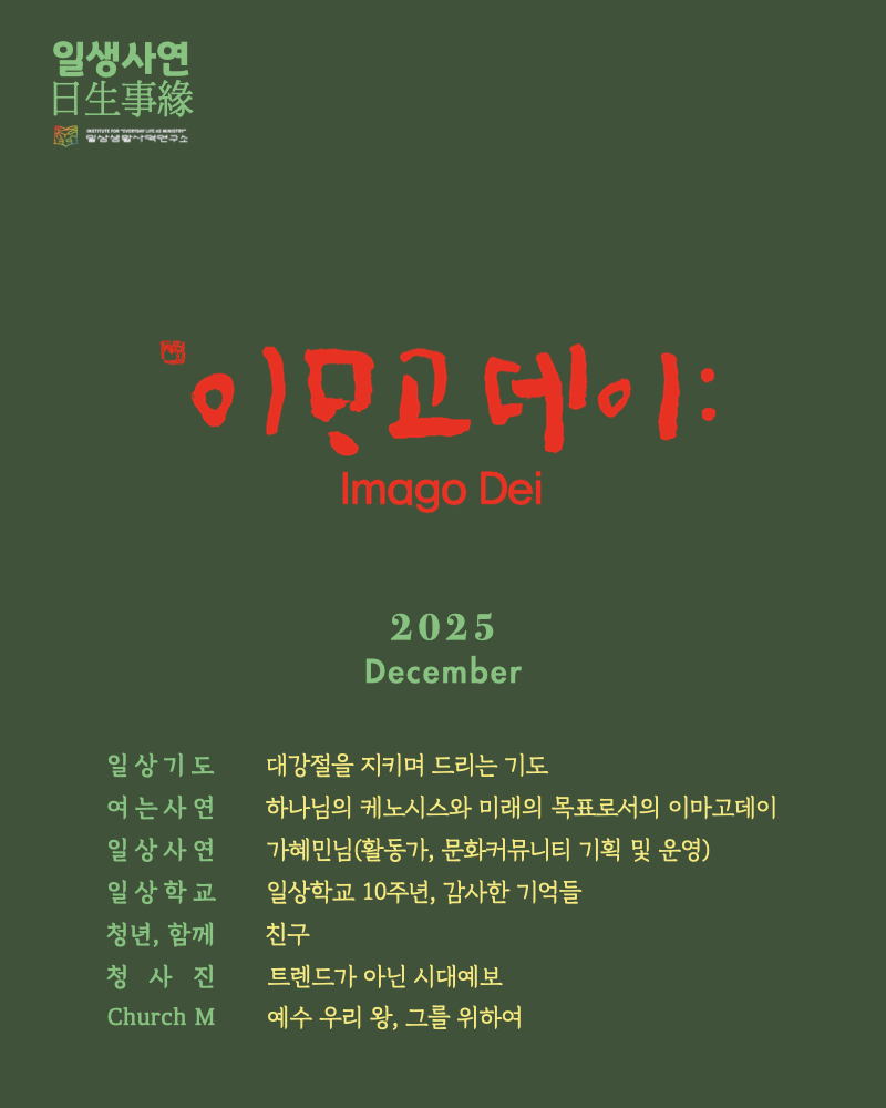 2025년 한해 우리 연구소는 복음(하나님), 문화(세상), 교회(하나님의 백성 공동체)의 미션얼 삼각 구도 가운데 복음, 즉 하나님이 어떤 분인가에 초점을 맞추는 첫 번째 시도로, “이마고데이(Imago Dei)”라는 주제로 일상생활의 신학과 미션얼 상상력을 심화하려고 애썼습니다. 이 주제는 우선 당장에 보기에는 인간론에 대한 언급이지만 하나님과 관련 속에서 인간을 생각하도록 합니다. 결국 복음, 그리고 하나님을 어떻게 이해하느냐에 따라 인간이 어떤 존재이며 어떻게 살아야 하는지가 결부됩니다. 당연히 그릇된 하나님 이해에서 하나님의 형상인 이마고데이로서 인간이해가 왜곡됩니다. “이ᄆᆞ고데이”라는 캘리그라피의 의도가 거기에 있었다는 것을 다시 한 번 언급하고 싶습니다.